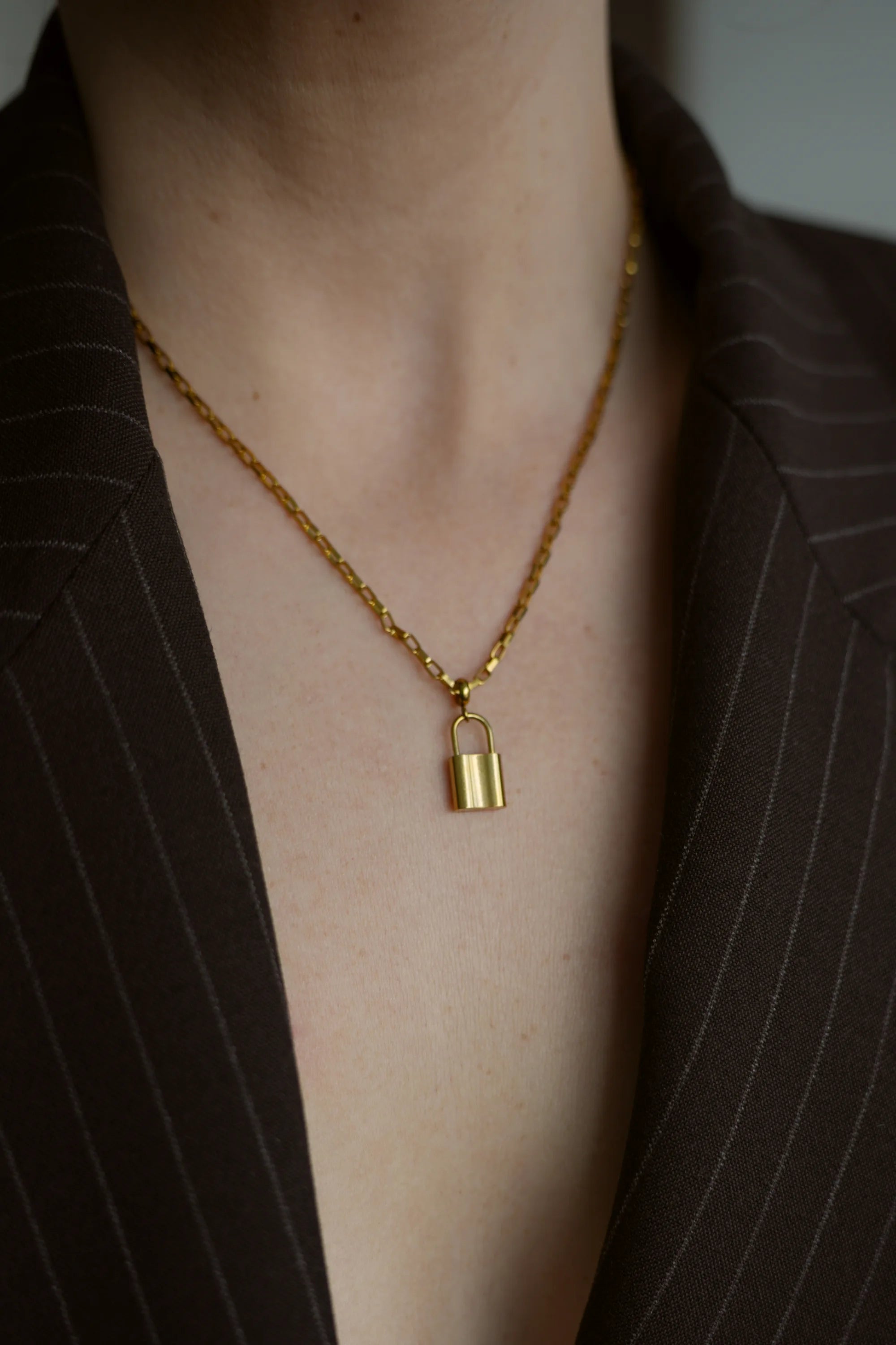 El candado de proporciones limpias se combina con la Box Link Chain, una cadena de eslabones rectangulares que aporta estructura y presencia visual. El contraste entre el diseño ligero del dije y la geometría definida de la cadena crea una pieza equilibrada, moderna y fácil de llevar.